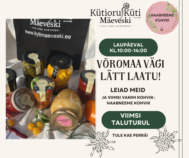 Meil Võrumaal on väge kuhjaga, ning eriti hoolikalt pannakse see vägi purki siis, kui aias hakkavad kõiksugu aed- ja köögiviljad valmima.Meie veski viimane viljajahvatus jääb oktoobrisse 2016. See, et veski ei jahvata, ei tähenda, et veskitalu jõude seisab! Veskil on oma õuna-jamarjaaed, usinad mesilased, väike viinamarjaistandus, lavendisiiluke ja igal aastal laiemaks veniv kõrvitsapeenar. Tegusa kogukonna- MTÜ Veskiveere kasvuhoonetes on lademetes tomateid, kurke, tšillisid, paprikaid, tegusamad toovad ämbrite kaupa seeni metsast koju ning kui see kõik südamega puki pannakse, ongi Võromaa vägi purgis! Ja kogu see Võromaa vägi on 11.oktoobris saadaval Viimsi Taluturul, Viimsi Vabaõhumuuseumi õuealal, kus igal laupäeval kl.10:00-14:00 saab osta kodumaist head ja paremat! Kütioru Küti Mäeveski „Võromaa vägi“ tooted leiad majakesest nr.10 Kambas on ka Viimsi vanim, aastast 1972 järjepidevalt tegutsenud kohvik- Haabneeme kohvik, kelle koduste toitude ning imemaitsvate kondiitritoodetega on mitu põlvakonda üles kasvanud! Igal oktoobrikuu laupäeval, kl.10.00.14:00, tule kae perrä, mida üks Võrumaa kant ja Viimsi vanim kohvik pakuvad!