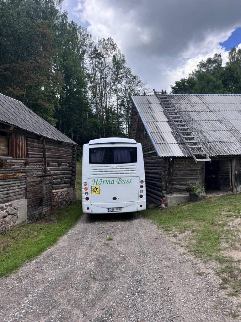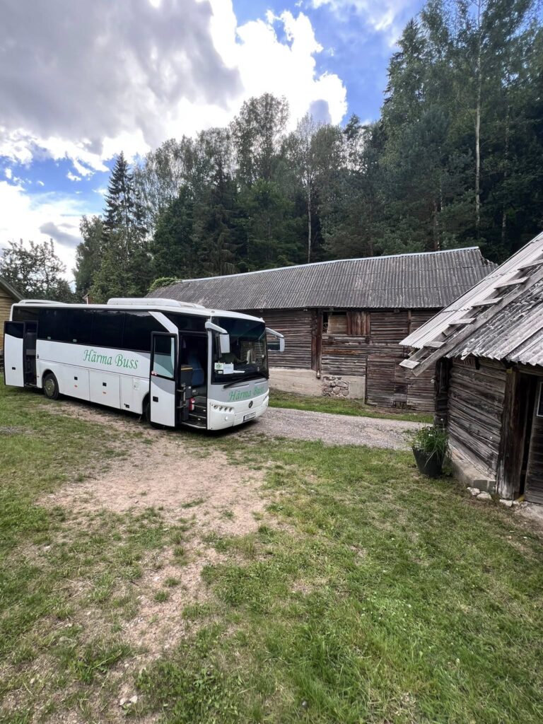 reisiseltskonda- Eesti Looduskaitse Seltsist, teele saatmas. Suur, valge buss kulgemas tasa ja targu kurvi taha, rõõmsad näod ja lehvitavad käed…